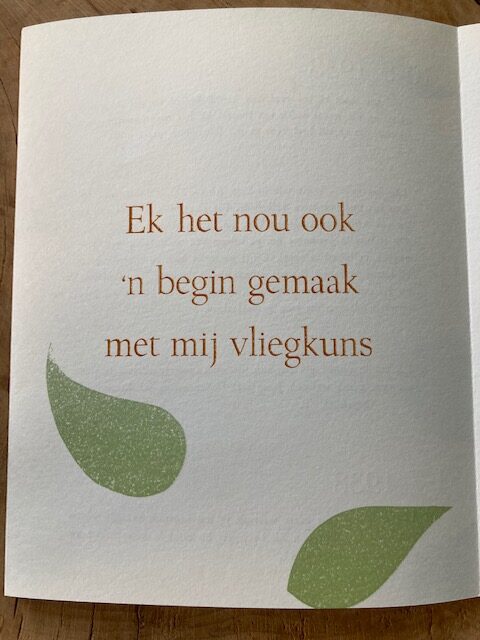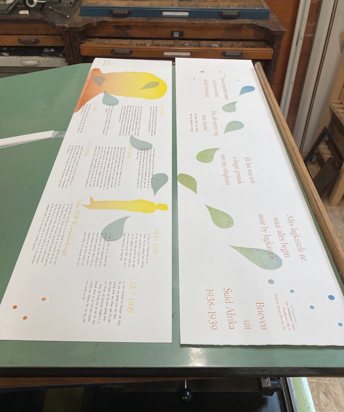 Ik drukte een aantal fragmenten – in de prachtige Zuid-Afrikaanse taal – die een kort verhaal vormen over het lief en leed van een jongeman in het aangezicht van WW II. Ook de temperaturen in mijn atelier bereikten de 33C° en dus konden we zeggen: ‘ons het nou hier somer, en dit is so warm dat die kraaie gaap’.