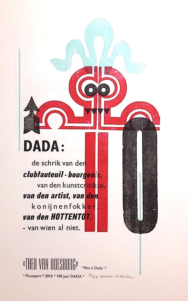 Ter gelegenheid van de reizende tentoonstelling ‘Dada ist 100’ van Marc Berger waarbij een internationaal gezelschap aan boekdrukkers een bijdrage leverde.