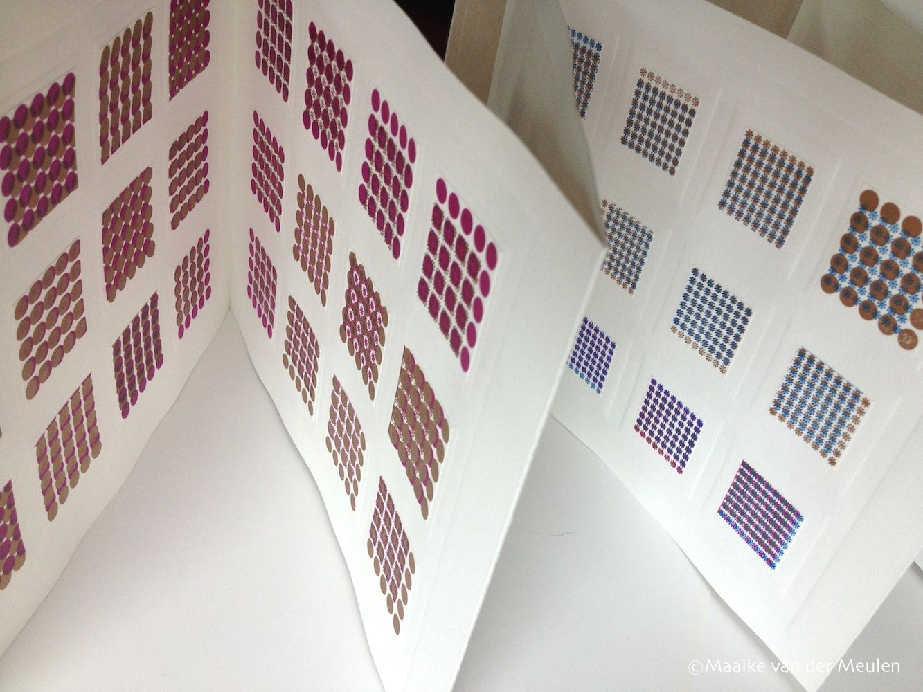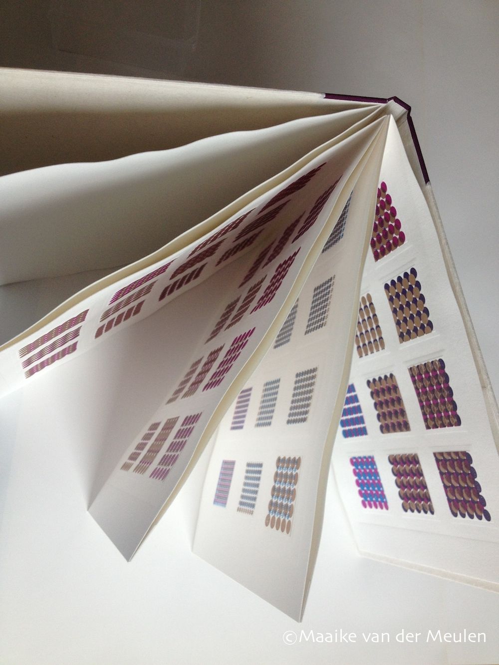 Uitvoering: leporello in harde kaft, verzameling als collage op geblinddrukte vellen.